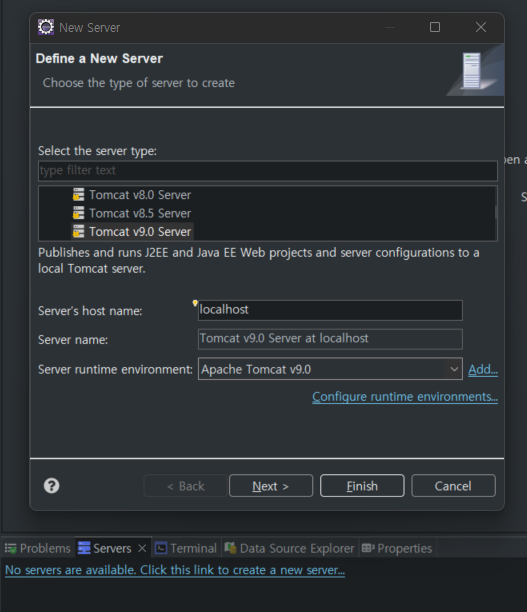 No servers are available. Click this link to create a new server... 클릭