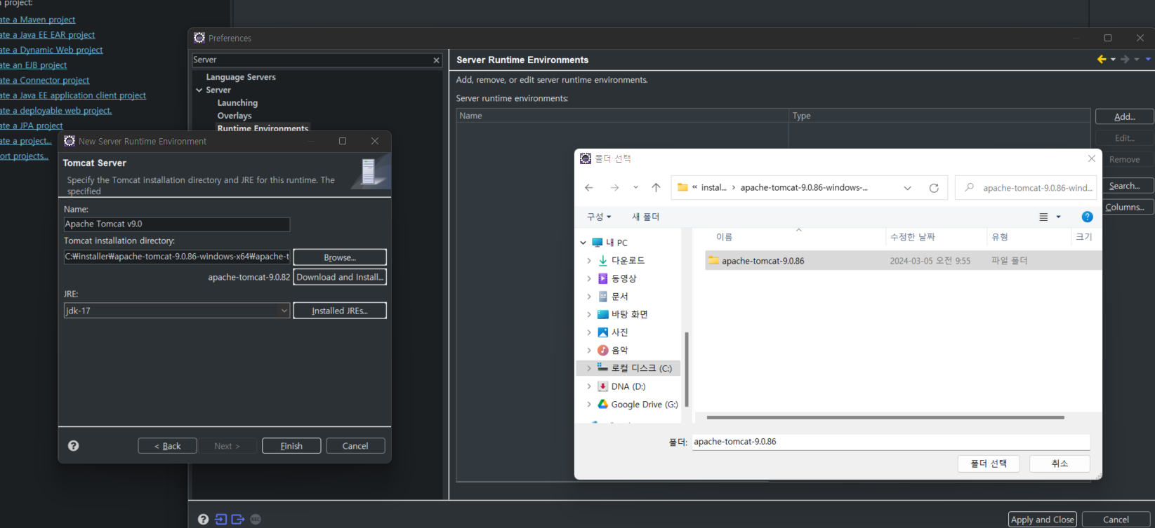 windows > preference > Server (검색) > Runtime Environments > add > Apache > Apache Tomcat v9.0(그림 참고) - jdk-17로 설정해야 함. [중요]