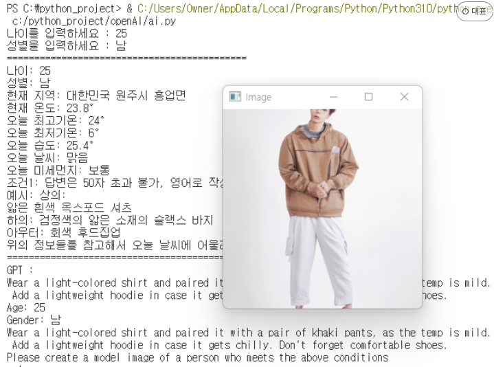 이렇게 코드는 사용자의 요청에 따른 날씨 정보와 옷 추천을 텍스트와 이미지로 제공하는 것을 목표로 하고 있습니다.