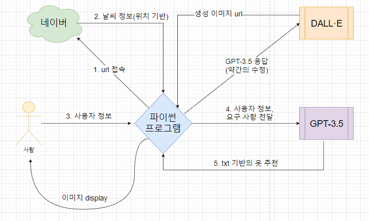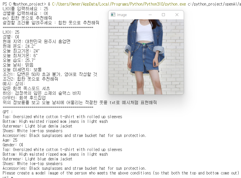 프로그램은 사용자의 요청에 따라 날씨에 적합한 옷 추천을 제공하고, 그에 맞는 이미지를 생성하여 출력하는 것입니다. 코드를 분석하면 다음과 같은 단계로 나누어 볼 수 있습니다.