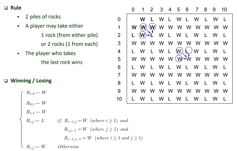 - 플레이어는 한 번에 다음 중 하나의 동작을 선택하여 수행할 수 있습니다: a) 양 더미 중 하나에서 1개의 돌을 가져옵니다. b) 각 더미에서 1개씩 총 2개의 돌을 가져옵니다.