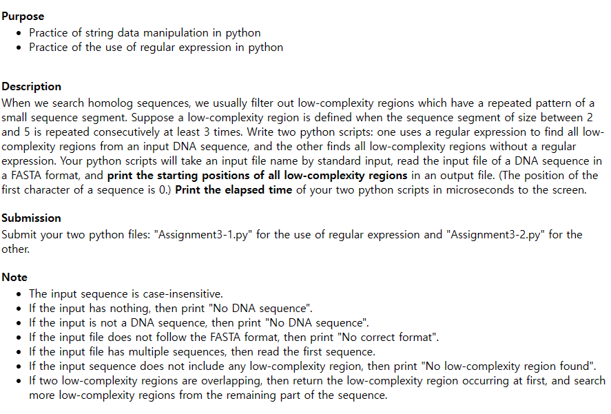 - find_low_complexity: 정규식을 사용하여 DNA 서열에서 낮은 복잡도 영역의 시작 위치를 찾는 함수입니다.